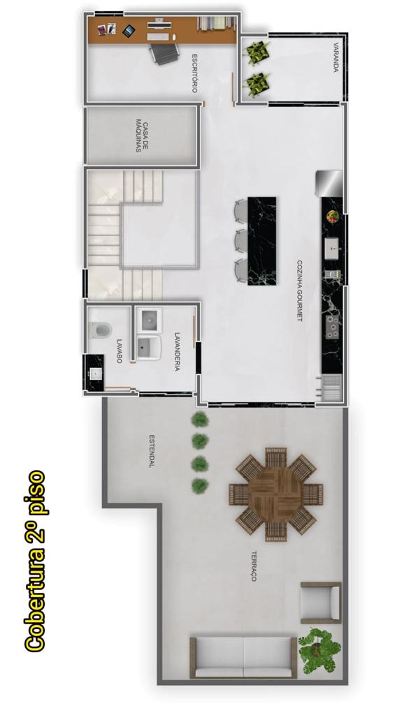 Parte de cima: cozinha gourmet, escritório, área de serviço, lavabo, opção de jacuzzi ou piscina.